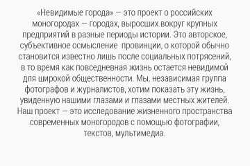 «Невидимые города» — это проект о российских моногородах — городах, выросших вокруг крупных предприятий в разные периоды истории. Это авторское, субъективное осмысление провинции, о которой обычно становится и...